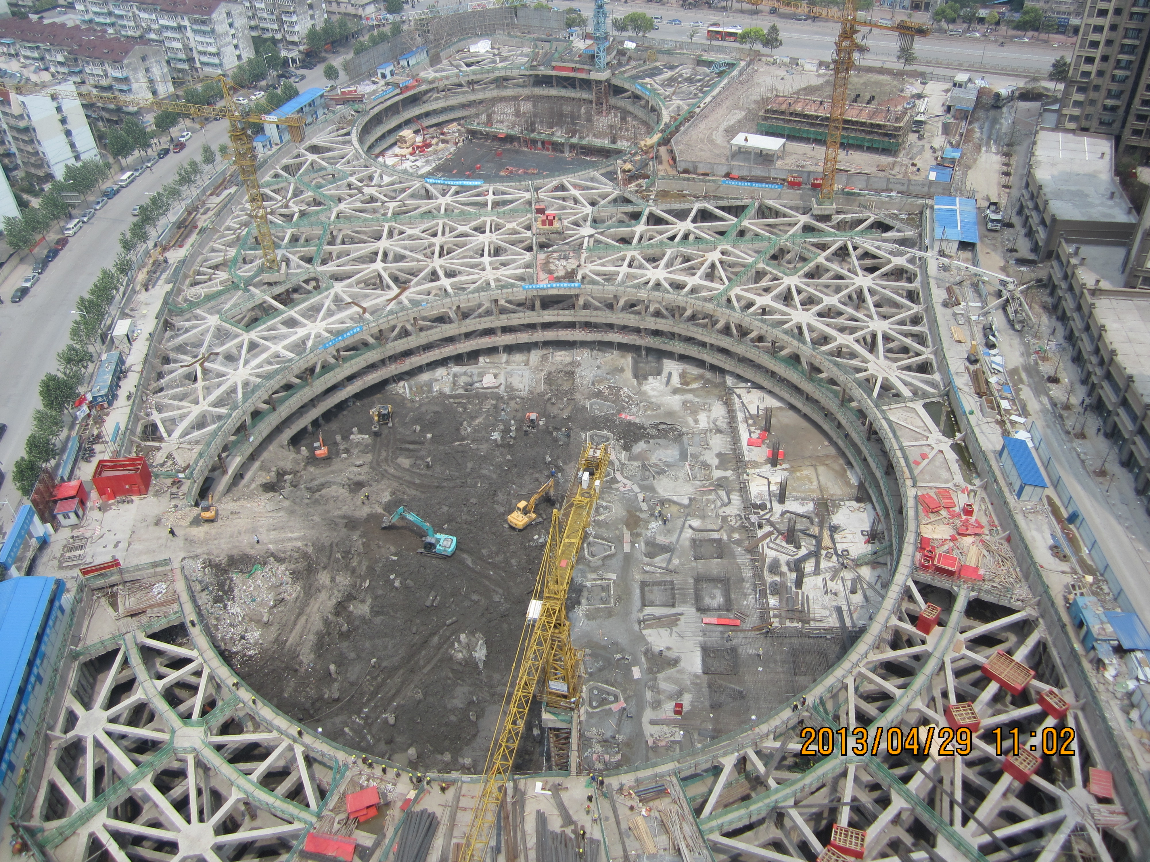 中海凤凰熙岸商业项目是中海地产倾力之作,项目位于南京市主城核心鼓楼腹地,占地3.3万平方米,总建筑面积约23万平方米,由8万平米的环宇城购物中心、4万平米甲级写字楼、6万平米酒店式公寓及可容纳1300个车辆的大型地下停车场组成,为一集商业、餐饮、娱乐、办公及住宅为一体的城市副中心级大型综合类项目。地面以下设整体满堂三层地下室,基坑总面积约28000m²,基坑开挖深度15.25~18.85m。支护设计方案采用钻孔灌注桩+竖向三层双圆环钢筋砼支撑体系,满足了办公楼施工工期的苛刻要求。作为南京软土地区首个采用双圆环支撑体系的深大基坑,项目的成功实施不仅有效地协调了主体结构与基坑工程施工的关系,取得了良好的经济与社会效益,更体现了公司勇于创新、追求卓越的经营理念。