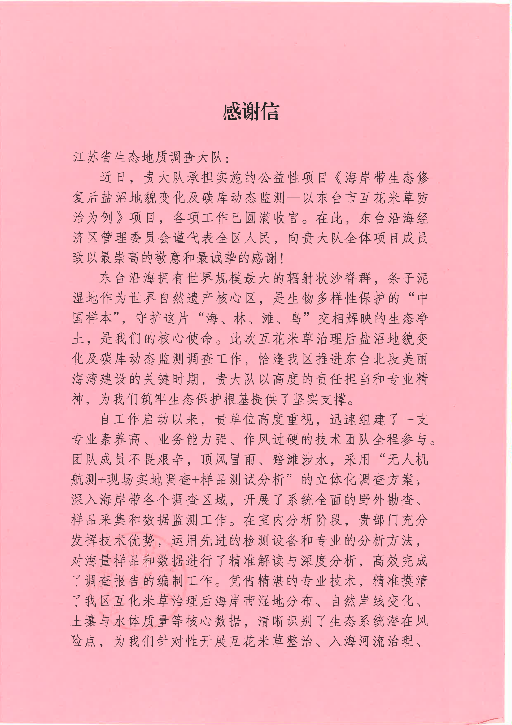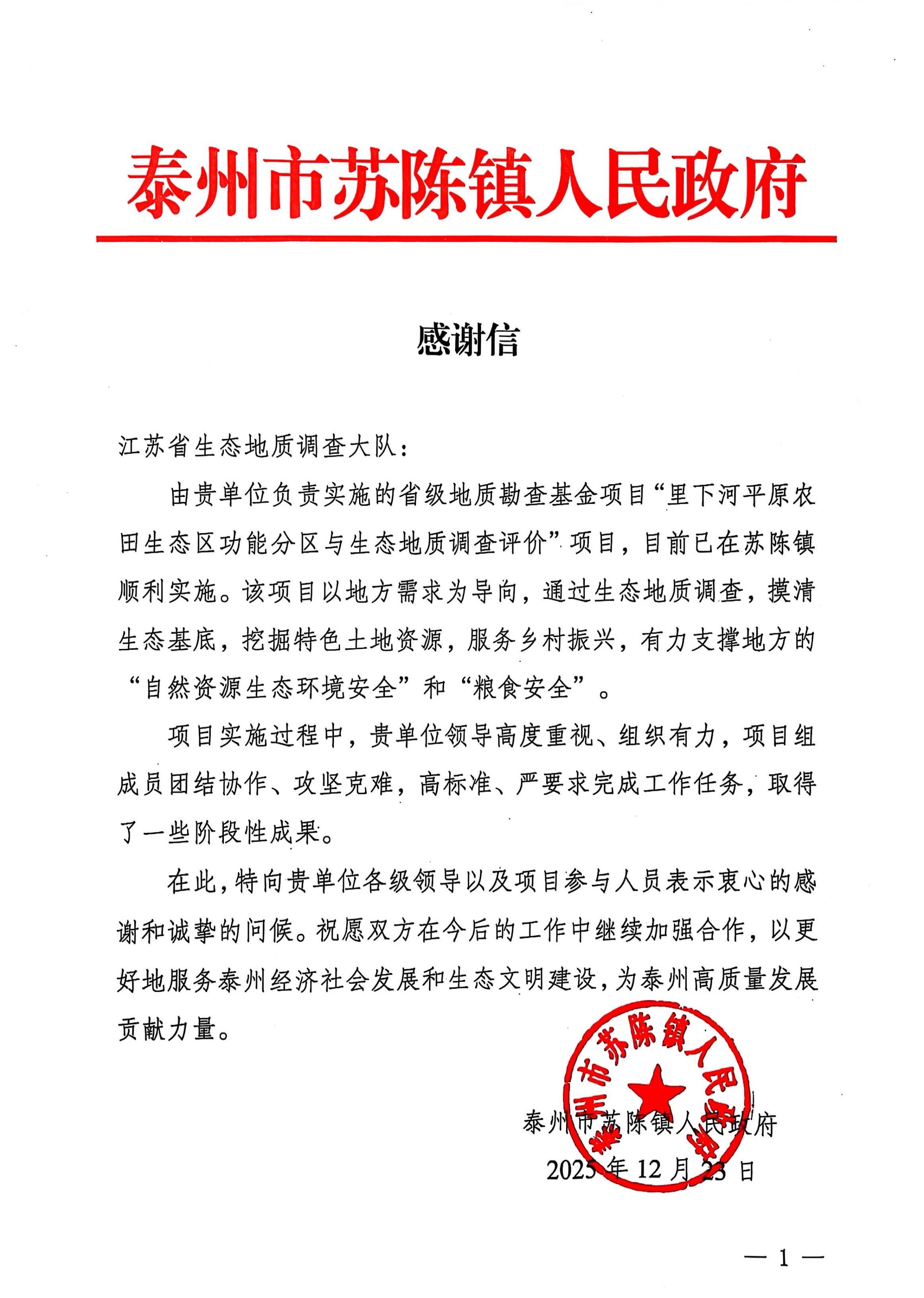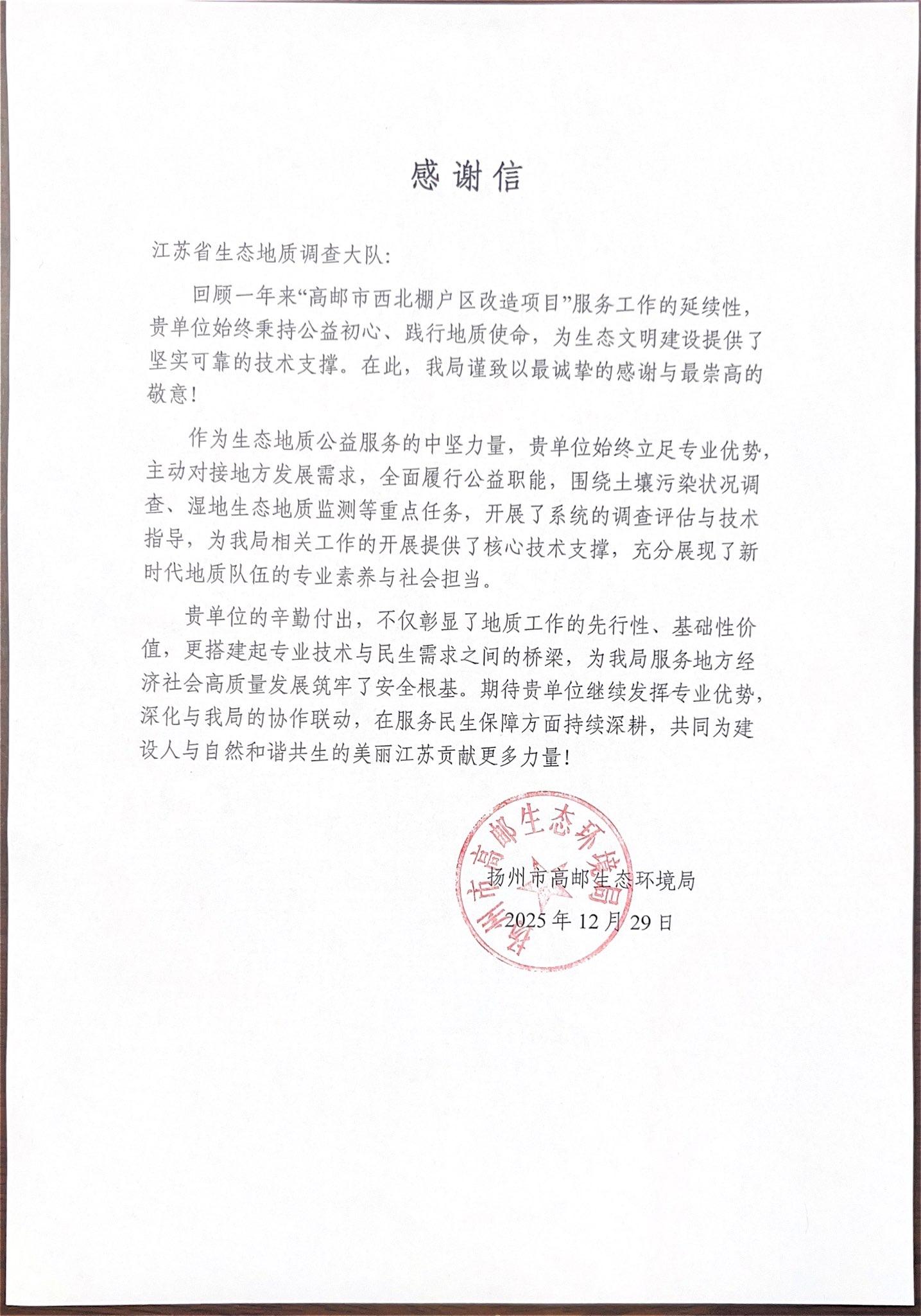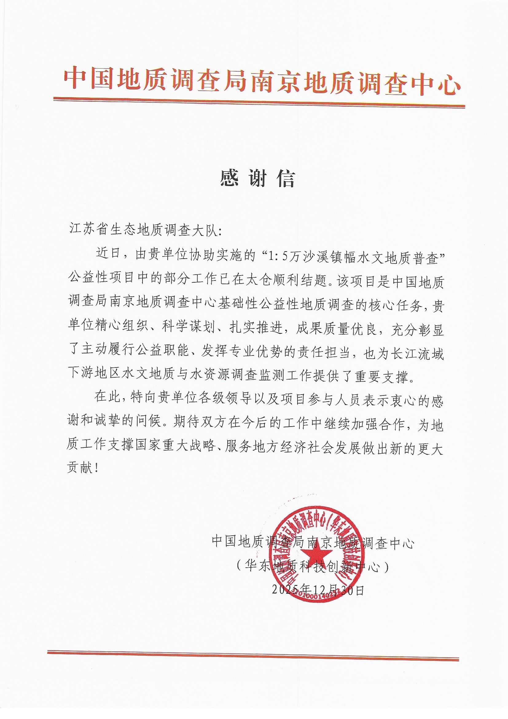 近日,江苏省生态地质调查大队陆续收到中国地质调查局南京地质调查中心、泰州市苏陈镇人民政府、扬州市高邮生态环境局等多家单位发来的感谢信。信中围绕水文地质普查、生态地质调查与评价、生态地质监测与环境治理、生态环保知识科普等合作事项,高度肯定并衷心感谢大队在过去一年中秉持公益初心,践行地质使命,充分发挥专业技术优势,服务地方发展所作的贡献。